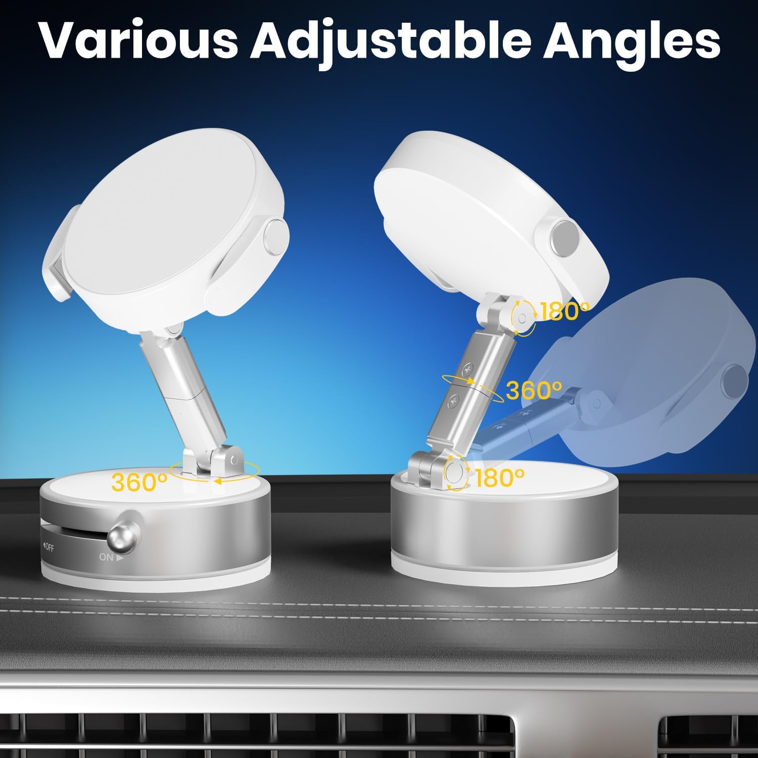 - 360° Rotation & Dual-Axis Adjustment: This vacuum magnetic suction phone mount features a 360° rotating base and 210° dual-axis folding metal arms, allowing easy angle adjustments to suit your needs. Whether in the car or at the office, switch between portrait and landscape modes effortlessly. Its unique folding design reduces the mount's size by 50% when not in use, keeping your space tidy. Tested over 3000 times for durability, it remains stable and reliable for long-term use