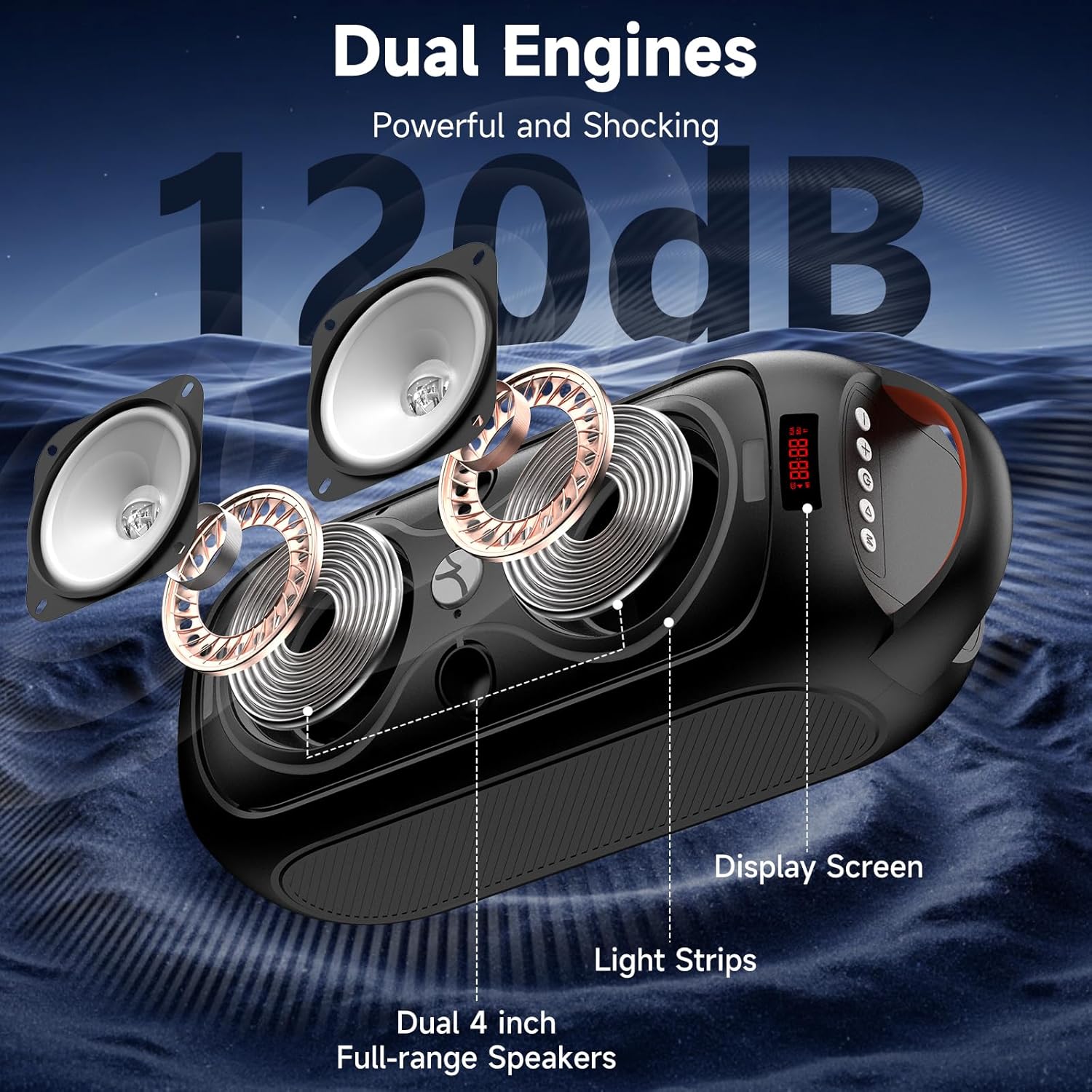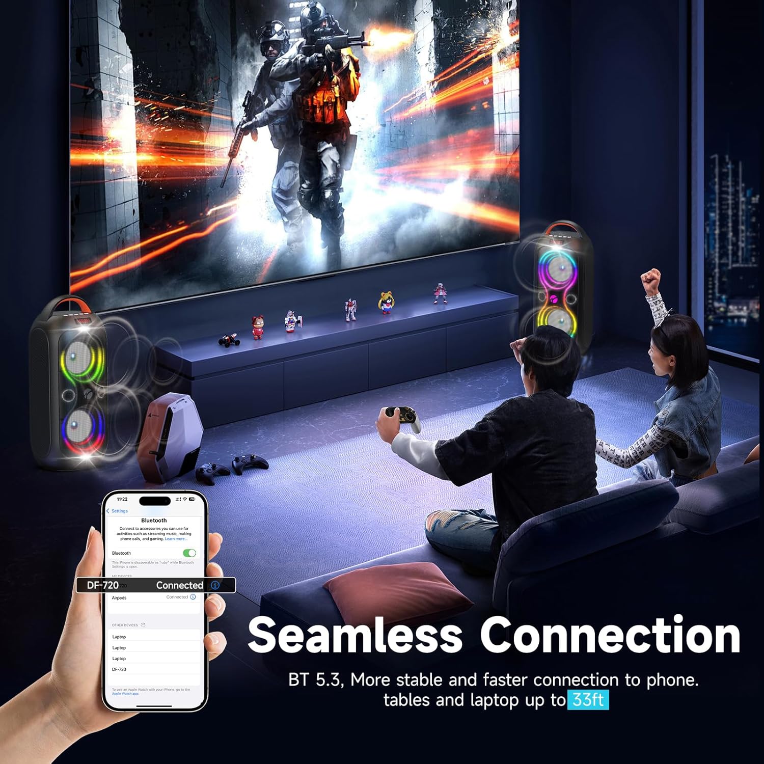 - 【120dB Powerful Sound | Portable Bluetooth Speaker】Dual 4-inch full-range drivers deliver crystal-clear highs and punchy mids, filling any space with immersive 120dB loud sound—perfect for transforming backyards, garages, or living rooms into dance floors. This portable Bluetooth speaker offers pro-level audio for parties, camping, and indoor gatherings.