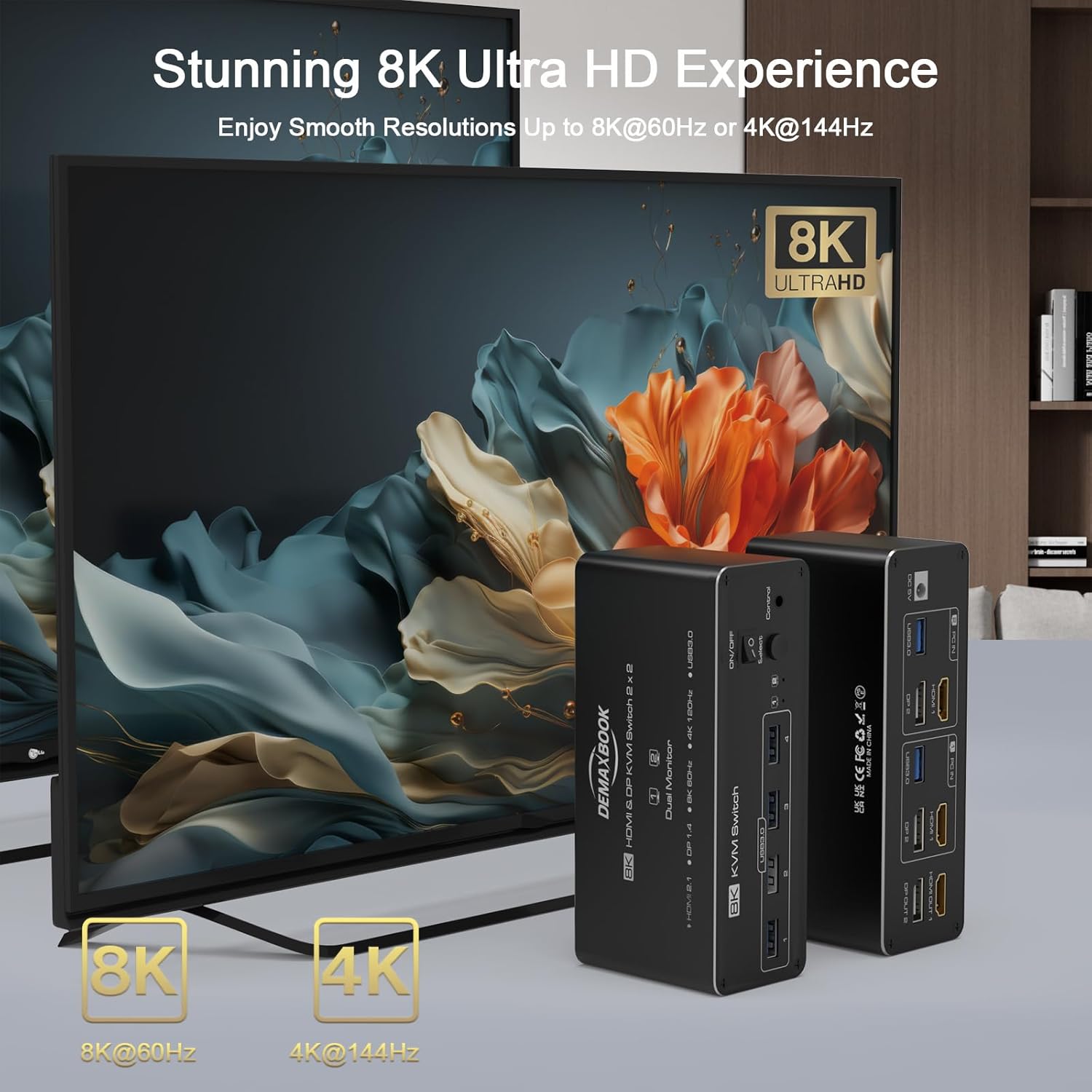 - ă8K & 4K Ultra HD SupportăThis Dual monitors HDMI2.1 + DP1.4 KVM switch supports 8K@60Hz and 4K@144Hz resolutions, providing crisp, high-quality visuals. Backward compatible with 4K@60Hz, 1080P, 2K, and 3D resolutions, it ensures stunning image quality across dual monitors.