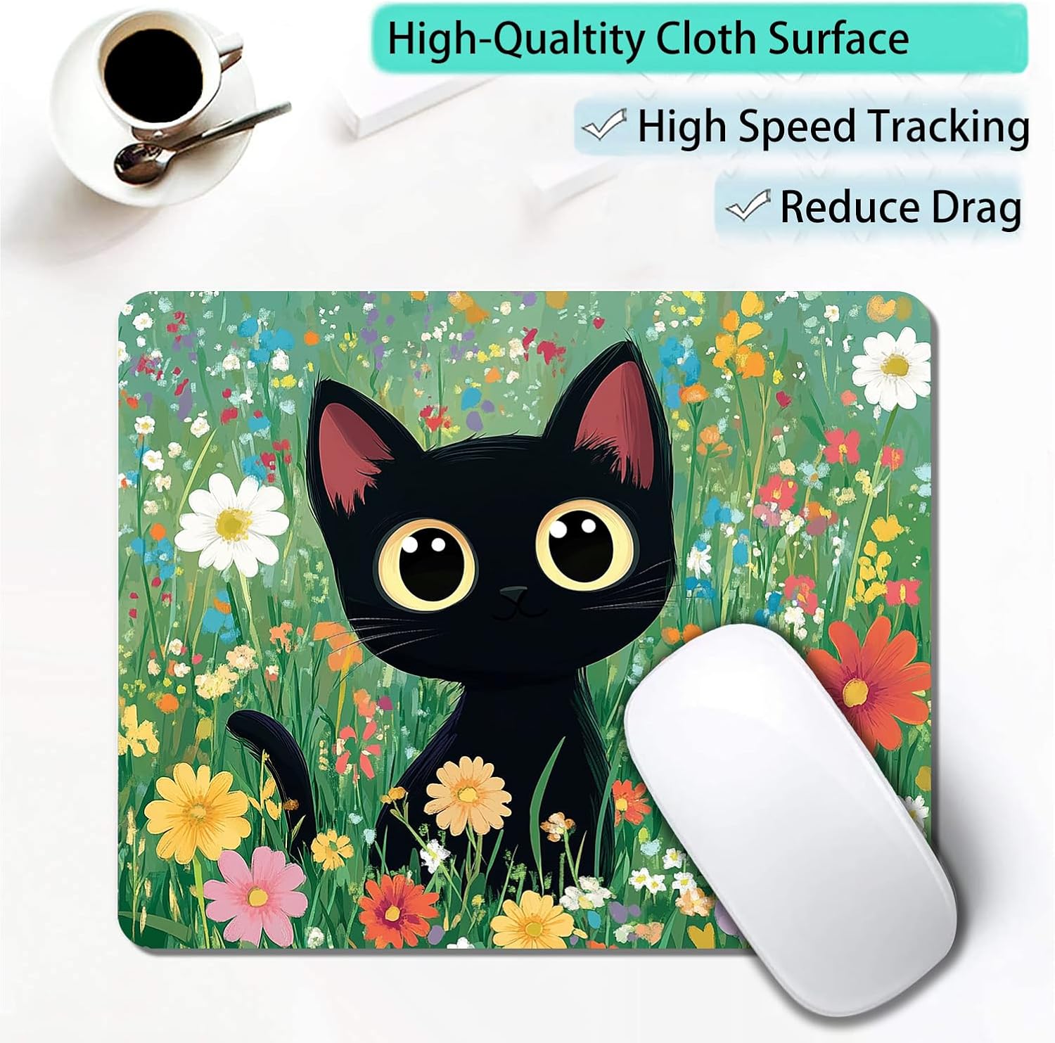 Cute Black Cat Floral Custom Mouse Pad with Non-Slip Rubber, Small Square Design for Wireless Laptop & Computer Mouse Pads for Desk, 9.5 x 7.9 inch Smooth Surface for Gaming & Office