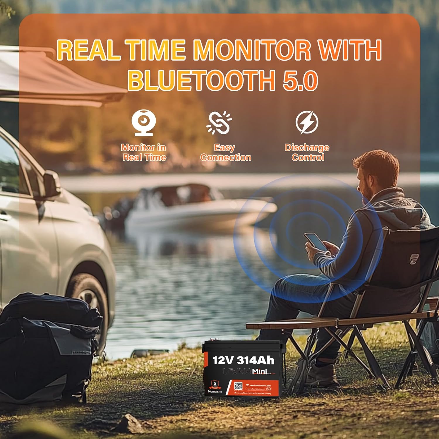 - ăSpace Saving & High Energy DensityăThe mini compact size of HumsiENK 12V 314Ah Bluetooth battery is 15.24Ă9.72Ă7.6 inches. Due to its high energy density, this battery has twice the usable capacity of lead-acid batteries and is 40% lighter in weight, making it easy to carry. Weighing only 61.73 pounds, it maintains high performance while taking up less space to fit seamlessly into various RV layouts.