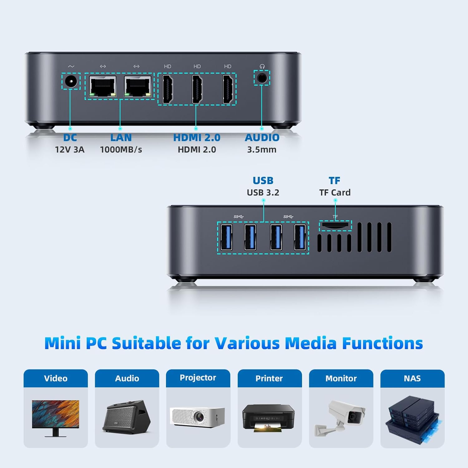 - Ultra-Compact & Versatile Design: Measuring just 5.45" x 5.45" x 1.45" and weighing only 500g, this space-saving mini PC fits anywhere. Mount it discreetly behind a monitor with VESA (bracket included) and connect peripherals easily via 4x USB 3.2, dual Gigabit Ethernet, 3x HDMI, and audio ports.