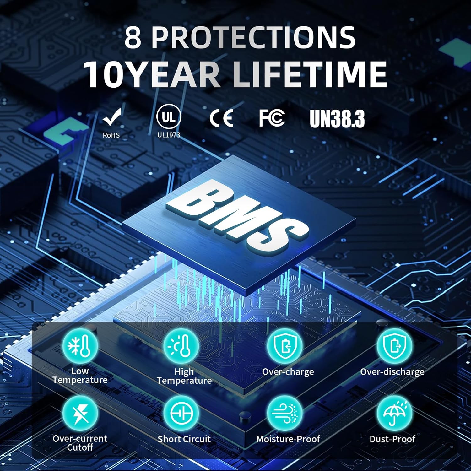 - 【Smart BMS with Multi-Layer Protection】 Built-in Battery Management System monitors voltage, current, and temperature in real time. Features 7-layer safeguards: overcharge/overdischarge, overcurrent, short-circuit, cell balancing, and dual-temperature cutoff. Maintenance-free design with zero memory effect – charge anytime, anywhere.
