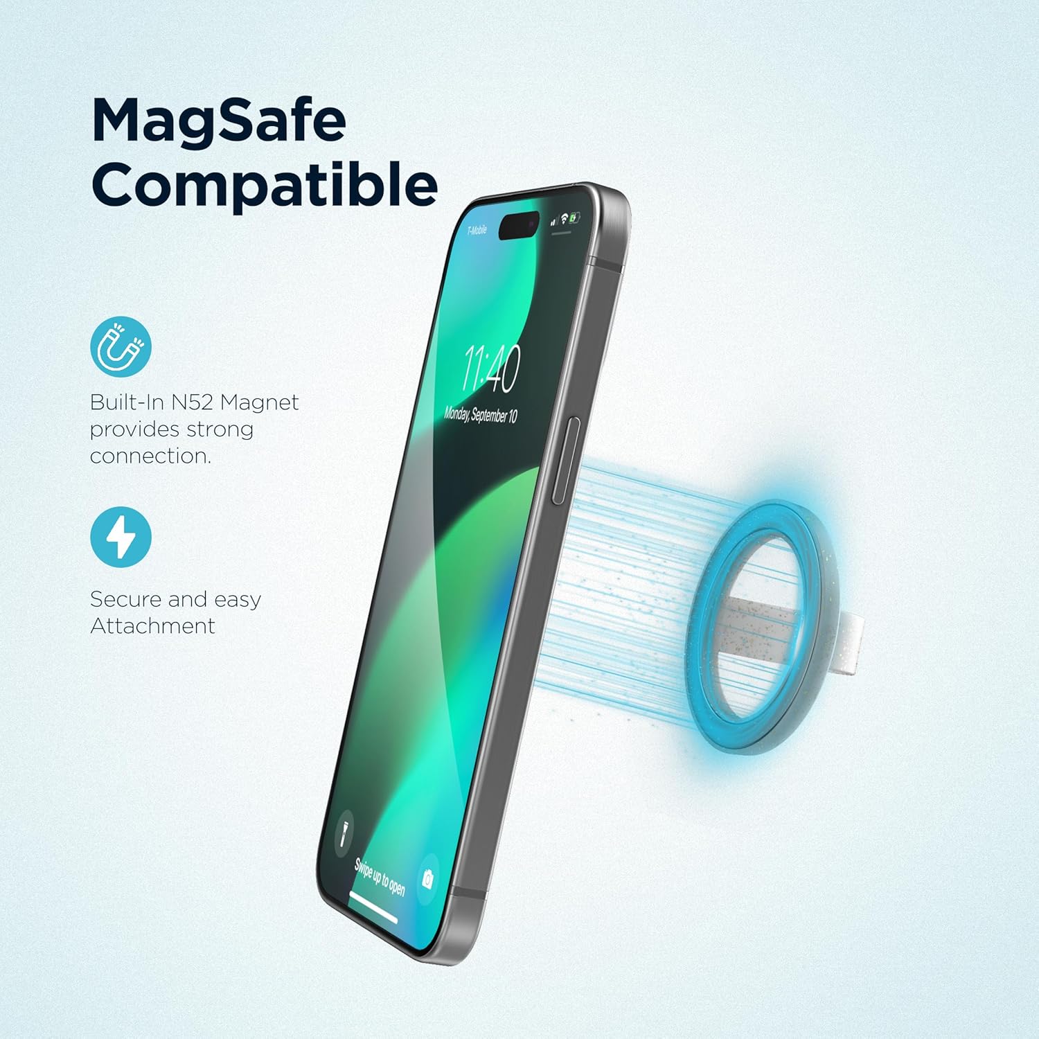 - Compatible with iPhones 12 and newer or any phone with a MagSafe-compatible case.