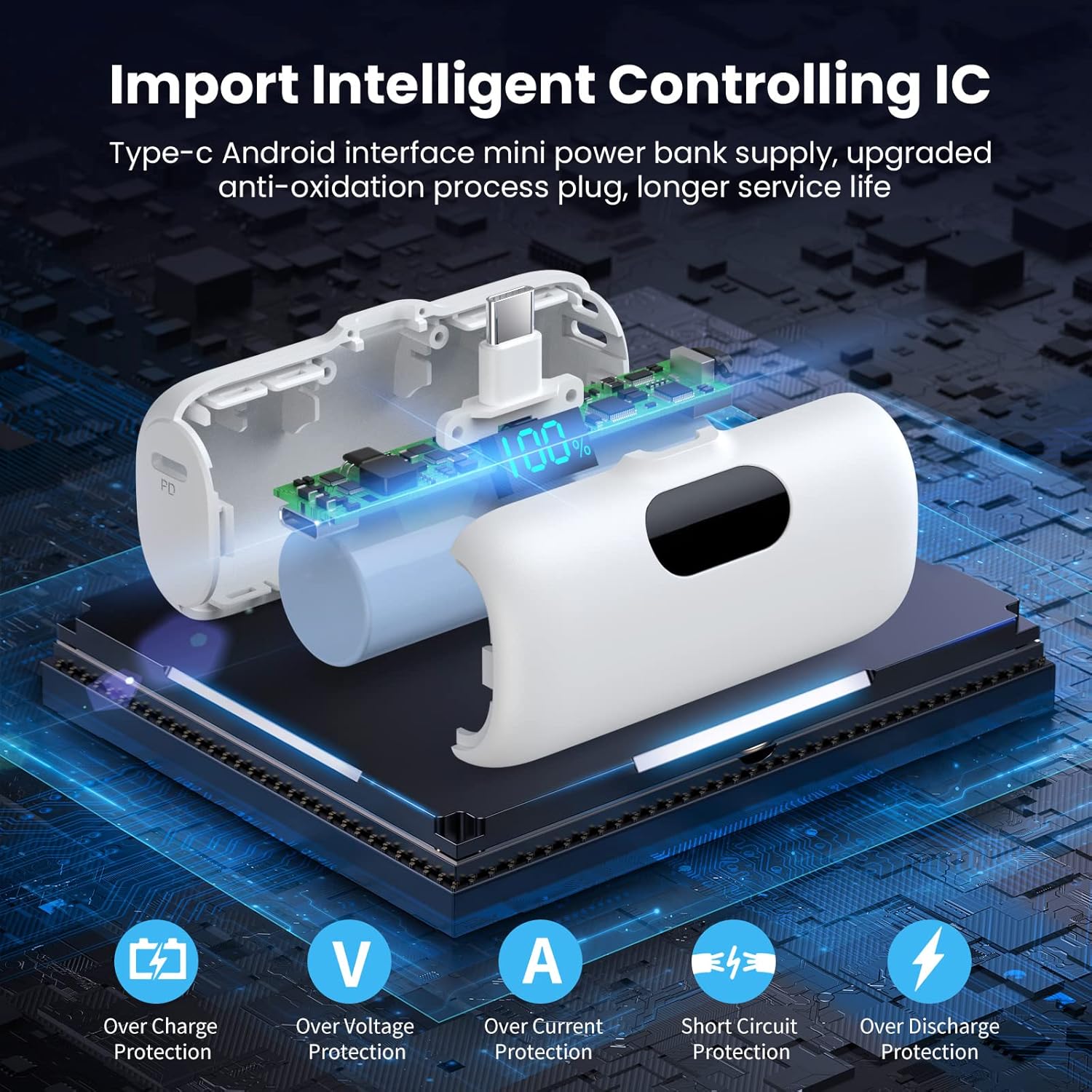 - ăPower Bank with Intelligent ProtectionăThis portable charger is equipped with a smart control IC chip that provides built-in overcharge, overvoltage, overcurrent, and short-circuit protection, ensuring that your smartphoneâs battery remains safe during the entire charging process. You can enjoy peace of mind knowing that your device is protected.