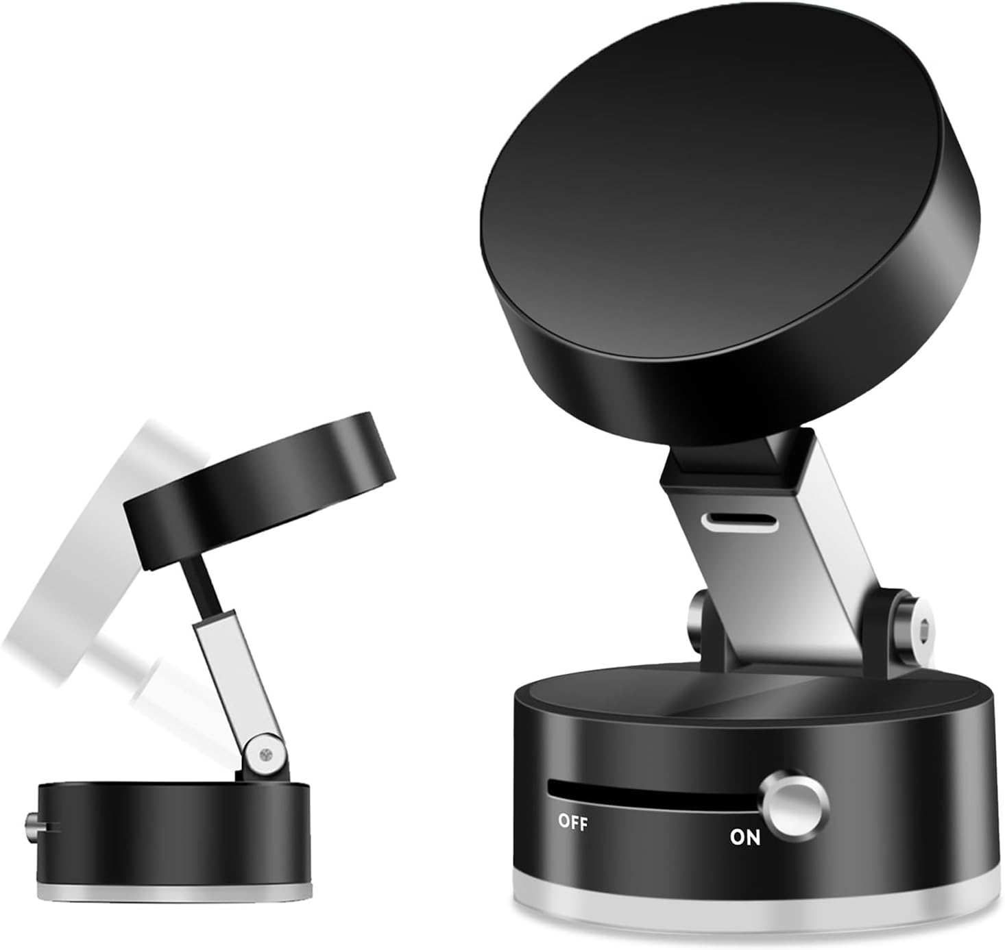 - ​One-Touch Operation for Effortless Use​-Just press to activate vacuum suction of magnetic suction phone mount - attaches in seconds! Removes cleanly with button press (no residue). Foldable design fits in your pocket. 180° adjustable arm provides perfect viewing angles in any situation