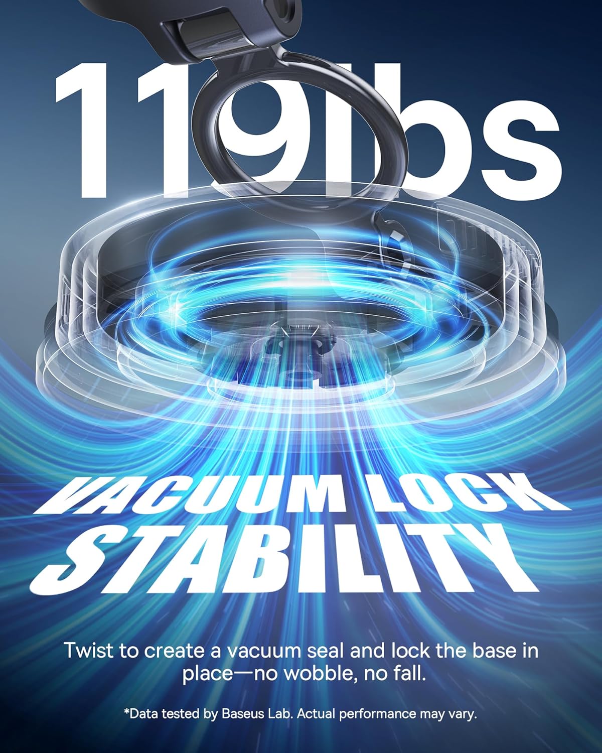- Vacuum Lock Stability: Simply twist to activate the vacuum seal and lock the base in place. Powered by Baseus premium vacuum tech and washable gel, this car mount holds up to 119 lbs without any shifting or wobble. Widely compatiable with leather, faux leather, pebbled surfaces, glass, plastic and other mainstream interiors.