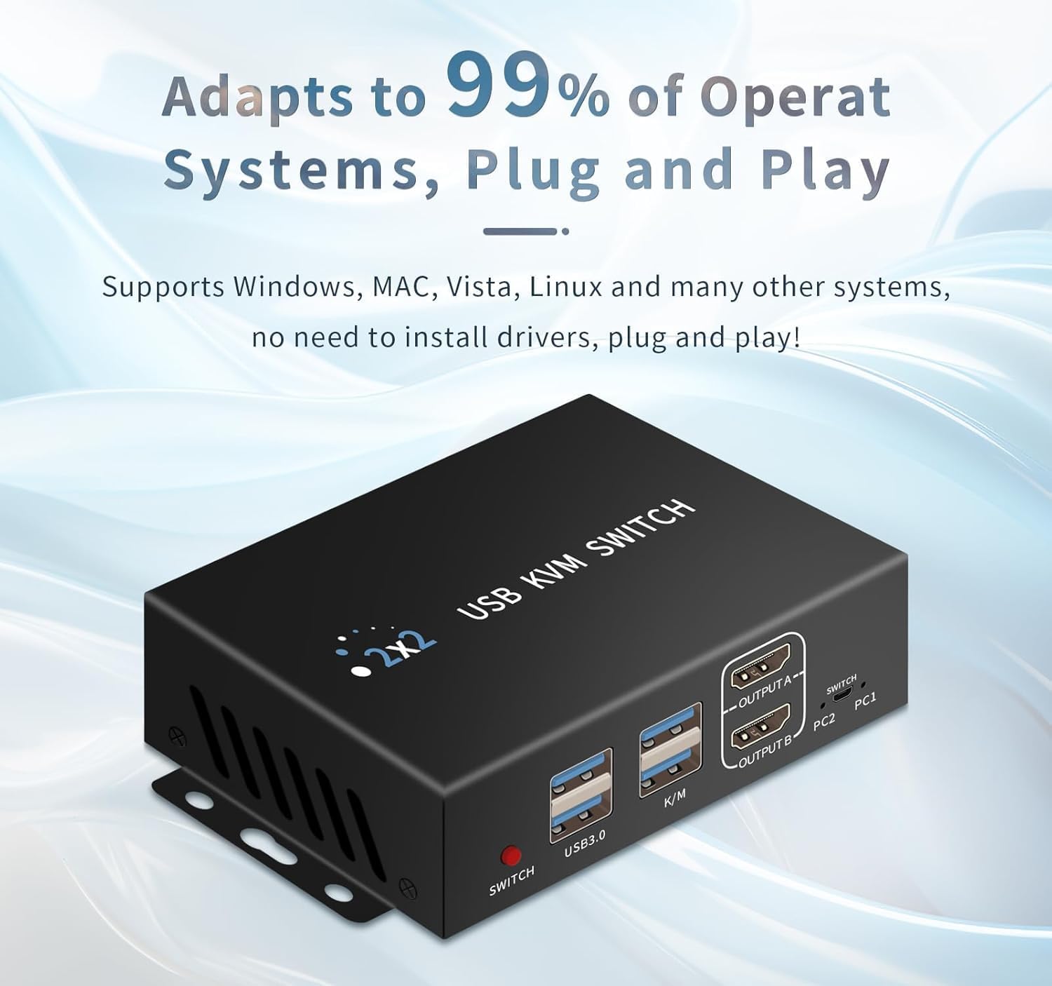 - 【HD 4K@60HZ and USB3.0】 HDMI KVM Switch supports resolutions such as 4K@60HZ and 2K@120HZ, 1K@144HZ, etc. Meanwhile, the USB also supports USB3.0, with a USB transfer rate up to 5Gbp/s, which is widely compatible with wired, 2.4G wireless, mechanical, and gaming keypads, etc. (wireless Bluetooth keypads are not supported), and it also supports Printers, scanners, USB cameras and USB sound cards can bring you a great sharing experience. Support Windows/Vista/XP and Mac OS, Linux and Unix and other operating systems.